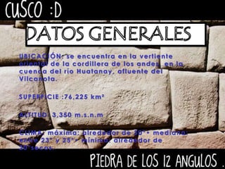 El documento proporciona información sobre la ciudad de Cusco, Perú. Cusco se encuentra en la cordillera de los Andes a una altitud de 3,350 metros sobre el nivel del mar. Tuvo su fundación durante el imperio incaico y posteriormente fue conquistada por los españoles en 1534. Actualmente es una importante ciudad turística conocida por su arquitectura colonial y ruinas incaicas.