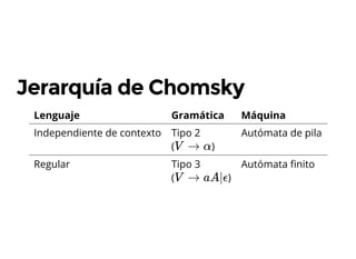 Este documento resume los conceptos clave de la jerarquía de Chomsky y los autómatas de pila. Explica que los lenguajes independientes de contexto son reconocidos por autómatas de pila, mientras que los lenguajes regulares son reconocidos por autómatas finitos. También introduce los lenguajes dependientes de contexto y propone ejemplos de gramáticas sensitivas al contexto.