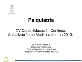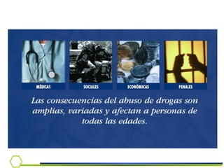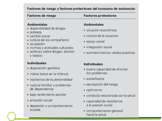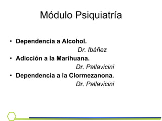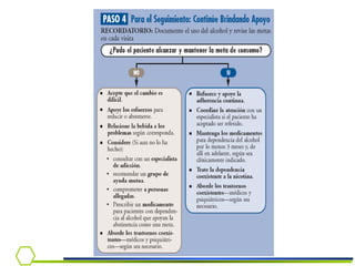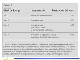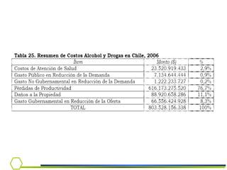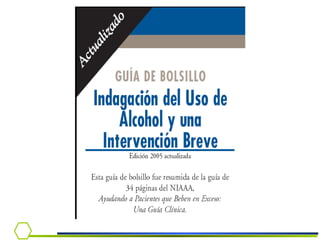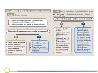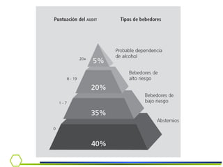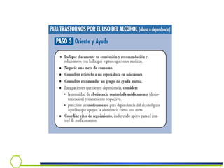 Este documento presenta información sobre la dependencia al alcohol. Cubre temas como la epidemiología del consumo de alcohol en Chile, criterios diagnósticos, síndrome de abstinencia, tratamiento y el rol del médico en la detección e intervención temprana.