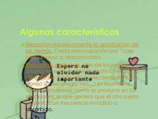 La dependencia emocional se refiere a una fuerte necesidad afectiva que una persona siente hacia otra, frecuentemente en parejas, amistades o familiares. Las personas con dependencia emocional necesitan excesivamente la aprobación de los demás, tienden a relaciones exclusivas, y generalmente adoptan una posición subordinada en las relaciones para mantener la conexión con la otra persona. El apego ansioso comparte similitudes con la dependencia emocional como el temor a la pérdida y la búsqueda de proximidad, pero se difer