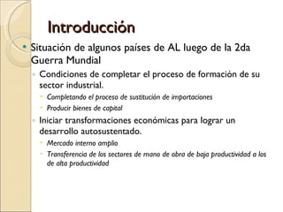 El documento presenta un resumen de los conceptos clave del libro Dependencia y Desarrollo en América Latina. Explica que en los años 1950, los países de América Latina buscaban desarrollarse a través de la industrialización y el mercado interno, pero que para fines de esa década muchas iniciativas fracasaron y el crecimiento económico no logró reducir la desigualdad. El documento también introduce conceptos como subdesarrollo, periferia y dependencia para analizar las limitaciones del desarrollo en la región.