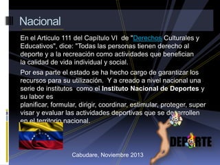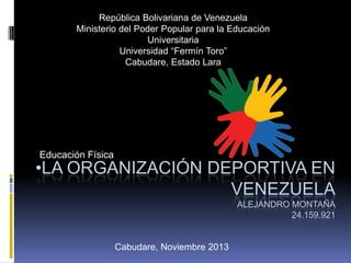 El documento describe la organización deportiva en Venezuela a nivel nacional, estadal y municipal. A nivel nacional, el Instituto Nacional de Deportes se encarga de planificar, coordinar y supervisar las actividades deportivas. A nivel estadal, el estado promueve el deporte en las escuelas y brinda atención al desarrollo deportivo de niños y adolescentes. A nivel municipal, los proyectos locales buscan satisfacer las demandas de los habitantes locales y mejorar las instalaciones deportivas. El documento también discute brevemente el atletismo y la participación de