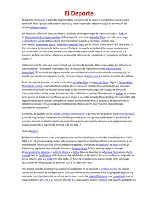 El deporte es una actividad física reglamentada y competitiva que mejora la salud física y mental. Los antiguos griegos crearon los Juegos Olímpicos y celebraron competiciones deportivas. En la actualidad, el deporte es una industria global multimillonaria y una parte importante de la cultura de muchas naciones.