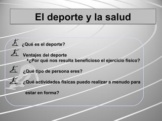 Este documento trata sobre los beneficios del deporte para la salud y la calidad de vida. Explica que la práctica moderada de actividad física es necesaria para vivir bien y prevenir enfermedades. También describe diferentes tipos de personas según su nivel de actividad física y la importancia del deporte en la escuela a través de programas como PROADES. Finalmente, analiza el deporte como fenómeno social y su influencia en los medios de comunicación.