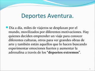 Este documento describe varios deportes extremos populares como el mountain biking, bungee jumping, surf, windsurf, kayak, escalada, rafting, kitesurf, esquí y snowboard. Proporciona detalles breves sobre cada deporte, incluidos los equipos necesarios, habilidades requeridas y riesgos asociados. El objetivo es informar a los lectores sobre opciones emocionantes para buscar adrenalina a través de actividades al aire libre.