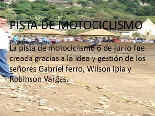 El documento describe dos deportes extremos practicados en Páez-Belalcázar, Colombia: motociclismo y parapente. La pista de motociclismo 6 de junio fue creada por Gabriel ferro, Wilson Ipia y Robinson Vargas según el diseño de Elkin Osorio.