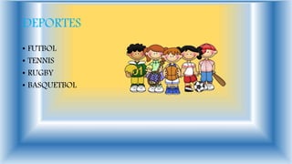 El documento describe cuatro deportes populares: fútbol, tenis, rugby y baloncesto. Proporciona detalles breves sobre cada uno, incluido el número de jugadores, el objetivo y la historia básica. El fútbol es el deporte más jugado con 270 millones de personas y se juega entre dos equipos de 11. El tenis es un deporte de raqueta entre dos o cuatro jugadores. El rugby se originó en Inglaterra y requiere contacto físico entre equipos. El baloncesto se juega entre dos equipos de cin