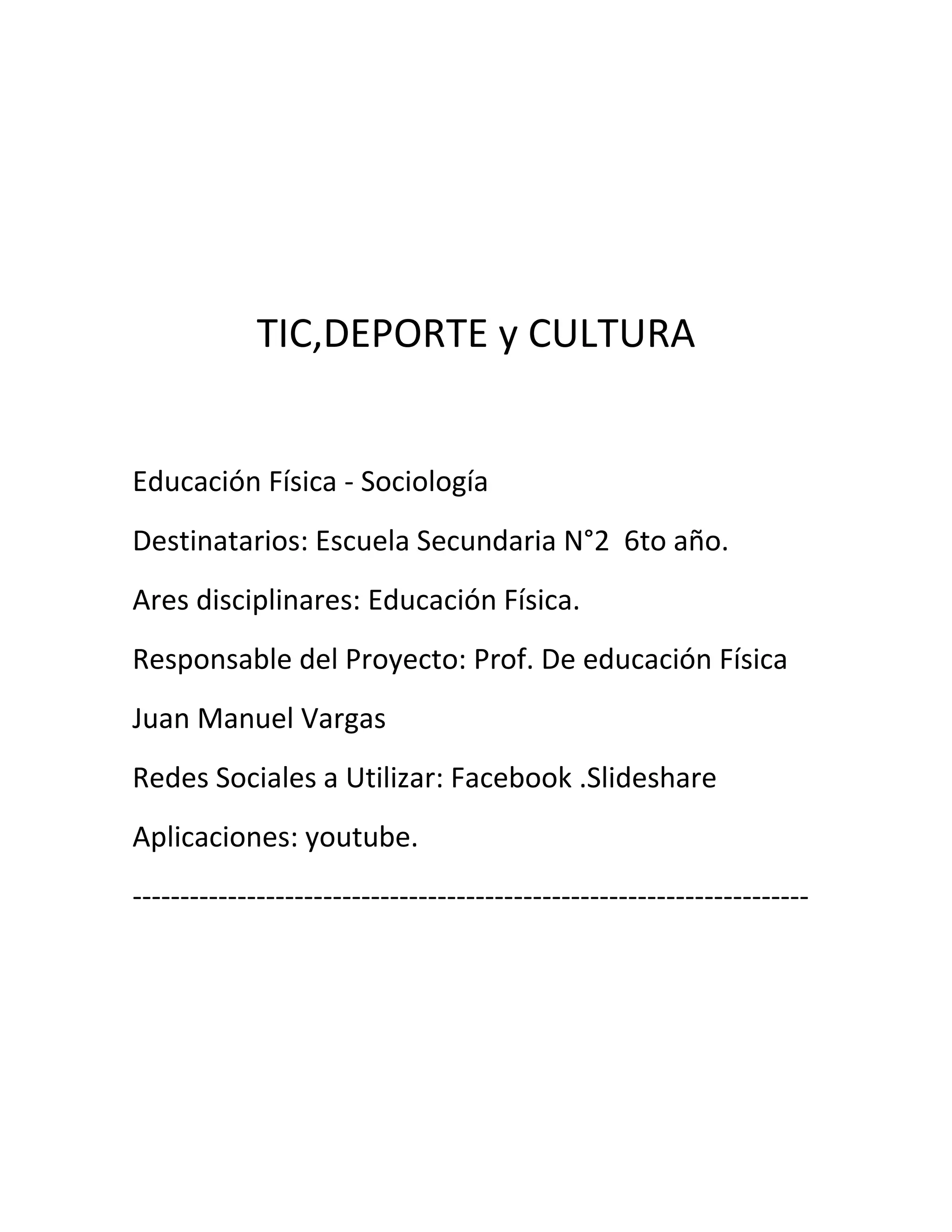 Este proyecto educativo busca integrar las tecnologías de la información y la comunicación (TIC), el deporte y la cultura en la enseñanza de la educación física. El proyecto utilizará plataformas como Facebook y YouTube, así como computadoras y cámaras de video, para crear procesos pedagógicos más dinámicos y creativos que permitan a los estudiantes desarrollar una comprensión crítica de cómo las TIC influyen en lo social y educativo. El proyecto tendrá una duración de 30