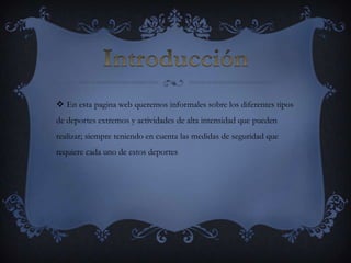 Este documento habla sobre los deportes extremos y actividades de alto riesgo, definiéndolos como aquellos deportes o actividades recreativas profesionales que implican peligro debido a las condiciones difíciles en las que se practican. Explica que estos deportes deben practicarse con estrictas medidas de seguridad especificadas en las reglas de cada uno para evitar lesiones graves o la muerte, y alienta a los lectores a explorar más información en la página web sobre estos deportes emocionantes.
