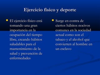 El documento describe los beneficios del ejercicio físico y el deporte para la salud, pero también advierte sobre los riesgos de realizar actividades con demasiada intensidad o de manera incorrecta. Explica que el ejercicio debe realizarse a una intensidad moderada entre el 60-90% de la frecuencia cardíaca máxima, con una duración de 15 a 60 minutos y al menos 3 veces por semana, para obtener beneficios sin riesgos para la salud.