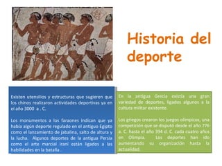 Este documento resume la historia del deporte desde la antigüedad hasta la actualidad y analiza las causas y manifestaciones de la violencia en el deporte, particularmente en el fútbol. Explica que aunque el deporte surgió para promover la salud y diversión, a menudo genera violencia entre jugadores y seguidores debido a factores como la falta de educación, la promoción de la agresividad por parte de los medios y las autoridades, y la imitación de modelos violentos. Propone soluciones como la educación, prohibir el acceso a