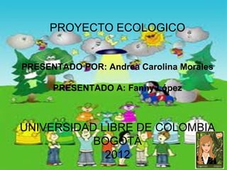 El documento presenta una propuesta de proyecto ecológico para la Universidad Libre de Colombia en Bogotá en 2012. La propuesta incluye actividades ecoturísticas y de aventura como caminatas, descensos en ríos, y rappel en cascadas con el objetivo de educar a los participantes sobre la importancia de la conservación de la naturaleza y las culturas locales. Las actividades serían guiadas por profesionales calificados y buscan minimizar el impacto ambiental y respetar el patrimonio cultural.
