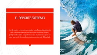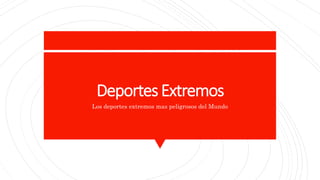 Este documento describe algunos de los deportes extremos más peligrosos del mundo, incluyendo el paracaidismo, bungee jumping, rafting, alpinismo y rapel. Cada actividad conlleva un alto riesgo y dificultad debido a las condiciones extremas como alturas, corrientes de ríos o pendientes empinadas que los practicantes enfrentan.