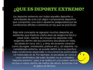 Los deportes extremos son actividades que implican un componente de peligro debido a las condiciones desafiantes en las que se practican. Incluyen disciplinas como el parkour, surf, slackline, barranquismo, bungee, paracaidismo y descenso de ríos, y son usualmente llevadas a cabo por personas que buscan aventura y adrenalina. La práctica de estos deportes requiere habilidades físicas y mentales, así como precauciones para mitigar riesgos.