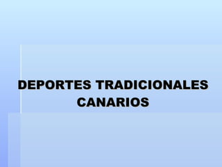 El documento describe varios deportes y juegos tradicionales canarios como el salto del pastor, pelotamano, calabazo, lucha canaria, arrastre de ganado, pina, levantamiento del arado, bola canaria, juego del palo, levantamiento de piedra, billarda, tablas de San Andrés y vela latina. Cada uno tiene reglas y características únicas que reflejan las tradiciones agrícolas y pastoriles de las Islas Canarias.