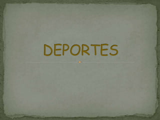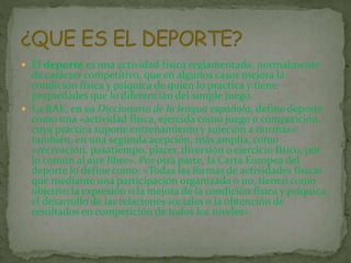 El documento define el deporte como una actividad física reglamentada que se practica de forma recreativa, profesional o para mejorar la salud. Explica que el deporte tiene una larga historia y que en la antigüedad ya se practicaba en ciudades como la antigua Grecia, donde se organizaron los primeros Juegos Olímpicos para honrar a Zeus.