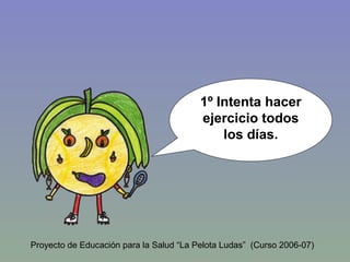 El documento presenta 10 consejos para el buen deportista como parte del proyecto "La Pelota Ludas" de educación para la salud y consumo responsable del curso 2006-07, incluyendo hacer ejercicio diario, alimentarse y hidratarse adecuadamente, descansar, asearse después del ejercicio, no fumar ni beber, calentar antes del ejercicio, practicar deporte con otros, respetar las normas y divertirse haciendo ejercicio.