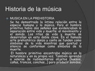La música ha tenido una íntima relación con la especie humana desde la prehistoria. Para el hombre primitivo, el movimiento y el sonido eran las señales que distinguían la vida de la muerte. En los ritos de vida y muerte de la prehistoria, la danza y el canto representaban símbolos de la vida, mientras el silencio era símbolo de la muerte. El hombre primitivo encontraba música en la naturaleza, su propia voz y mediante el uso de objetos rudimentarios como huesos, cañas y conchas