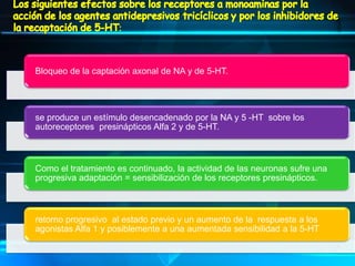 Este documento describe diferentes tipos de depresión y fármacos antidepresivos. Clasifica las depresiones como primaria o secundaria, psicótica o neurótica, y reactiva o endógena. Describe varios trastornos depresivos según el DSM-III-R como trastornos bipolares, depresivos y distimia. Explica los mecanismos de acción y efectos de antidepresivos tricíclicos, inhibidores de MAO, inhibidores selectivos de serotonina y benzodiacepinas. También