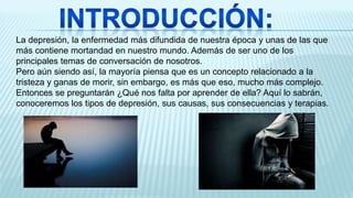 La depresión es un trastorno del estado de ánimo que afecta a muchas personas y va más allá de la tristeza, teniendo diversas causas, consecuencias y tipos. Se clasifica en varias categorías dependiendo de factores biológicos y ambientales, y sus síntomas incluyen pérdida de interés, trastornos del sueño y pensamientos suicidas. El tratamiento puede incluir terapia farmacológica, psicoterapia y cambios en el estilo de vida, siendo esencial el apoyo de familiares y amigos para su manejo.