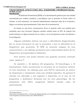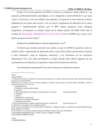 Este documento describe el trastorno disfórico de la fase luteal tardía (LLPDD), una forma severa del síndrome premenstrual que se caracteriza por la presencia de síntomas afectivos como labilidad emocional, irritabilidad, ansiedad y depresión durante la última semana del ciclo menstrual. A pesar de su alta prevalencia, el LLPDD es poco diagnosticado. El documento analiza los criterios diagnósticos propuestos para esta condición y discute su potencial para el estudio de la depresión cíclica y otros