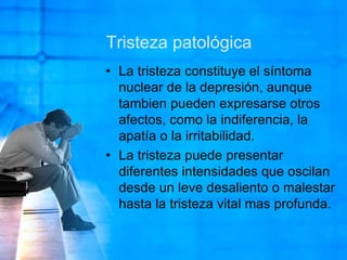 Este documento presenta información sobre la tristeza patológica y la depresión. Explica que la tristeza es el síntoma nuclear de la depresión y puede variar en intensidad. También cubre la clasificación, etiología, presentación clínica, diagnóstico y tratamiento de la depresión según criterios como la DSM-IV. El documento proporciona detalles sobre los síntomas depresivos, otros síntomas psiquiátricos, síntomas generales, y opciones de tratamiento como antidepresivos, psicoter