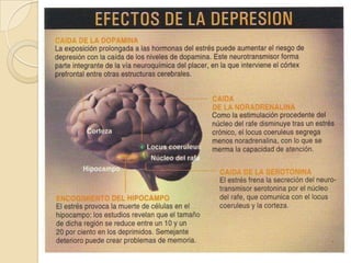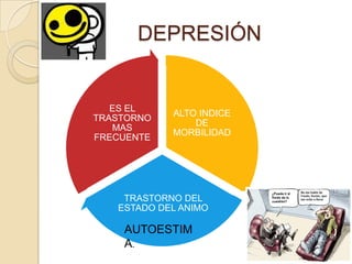 Este documento presenta información sobre la depresión. Brevemente describe que la depresión es el trastorno mental más común y frecuente, causado por un desequilibrio químico en el cerebro que afecta el estado de ánimo, pensamientos y comportamientos. También menciona algunos síntomas comunes de la depresión como la tristeza, culpa, ansiedad e ideas suicidas.