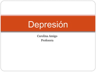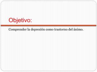 Este documento describe la depresión como un trastorno del ánimo caracterizado por una tristeza profunda e inhibición de las funciones psíquicas. Explica los criterios del DSM-IV para diagnosticar la depresión, incluyendo la presencia de al menos 5 de una lista de síntomas como estado de ánimo depresivo o pérdida de interés. También discute tratamientos como antidepresivos y psicoterapia.