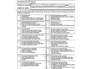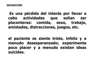 La depresión se define como una pérdida de interés en actividades placenteras y sentimientos de tristeza, infelicidad y desesperanza. Puede ser causada por factores endógenos, reactivos a pérdidas, o psicóticos con delirios. Se manifiesta a través de síntomas emocionales como tristeza, ansiedad e irritabilidad, síntomas físicos como dolor, fatiga e insomnio, e intelectuales como falta de concentración y de motivación. Se evalúa a través de invent