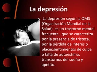 La depresión es un trastorno mental común definido por tristeza, pérdida de interés y otros síntomas que pueden ser causados por factores hereditarios, bioquímicos, estresantes y estacionales. Afecta a personas de todas las edades, incluyendo adultos, adolescentes y niños, pudiendo tener consecuencias graves como el suicidio si no se trata adecuadamente. El tratamiento incluye farmacoterapia y psicoterapia, así como estrategias de prevención como la reducción del estrés y el ejercicio.