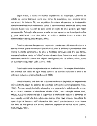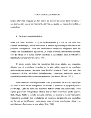 1. El documento describe varias explicaciones psicoanalíticas, psicosociales y conductuales de las causas de la depresión. Según el psicoanálisis, la depresión puede ser resultado de pérdidas en la infancia o problemas en el desarrollo temprano que llevan a baja autoestima. Las teorías psicosociales señalan que factores como el estrés social, roles de género y falta de apoyo aumentan el riesgo de depresión. Finalmente, las explicaciones conductuales ven a la depresión como consecuencia de bajo