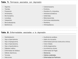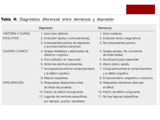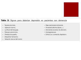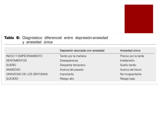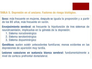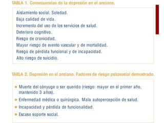 La depresión y la ansiedad en personas mayores no son partes normales del envejecimiento y afectan la calidad de vida y el manejo de enfermedades. El documento describe síntomas, etiología y diagnóstico de los trastornos del humor, así como escalas de evaluación y opciones de tratamiento como antidepresivos. Se enfatiza la importancia de prevenir el suicidio como complicación principal en estos pacientes.