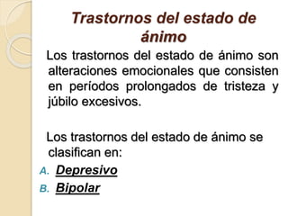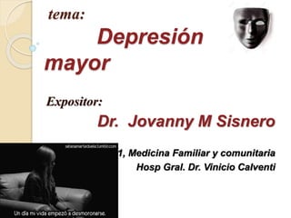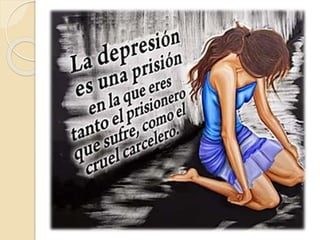 Este documento describe el trastorno depresivo mayor. Explica que se caracteriza por sentimientos prolongados de tristeza y falta de interés que interfieren con la vida diaria. Los síntomas incluyen cambios de estado de ánimo, apetito, sueño y energía. Se diagnostica según criterios como el DSM-5 y puede tratarse con medicamentos, psicoterapia o electroconvulsoterapia. La depresión es una de las principales causas de discapacidad en el mundo.