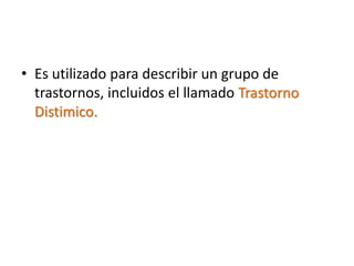 El documento describe el trastorno depresivo menor, comparándolo con el trastorno depresivo mayor. El trastorno depresivo menor se caracteriza por síntomas depresivos de menor gravedad que cumplen menos criterios que un episodio depresivo mayor. Se desconoce su etiología y epidemiología. El tratamiento recomendado incluye psicoterapia e inhibidores selectivos de la recaptación de serotonina.