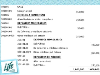 El documento presenta balances de cuentas de una institución bancaria, incluyendo cifras para caja, cheques a compensar, depósitos monetarios y depósitos de ahorro. Muestra saldos y detalles de subcuentas para diferentes períodos.