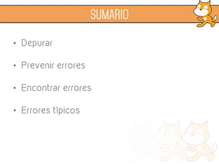 Este documento habla sobre la depuración de errores en Scratch. Explica que es importante prevenir errores mediante el uso de código ordenado, comentarios, nombres significativos y un desarrollo iterativo. También describe formas de encontrar errores como mostrar valores y aislar problemas, así como errores comunes relacionados con la sincronización, órdenes contradictorias e incompatibilidades.