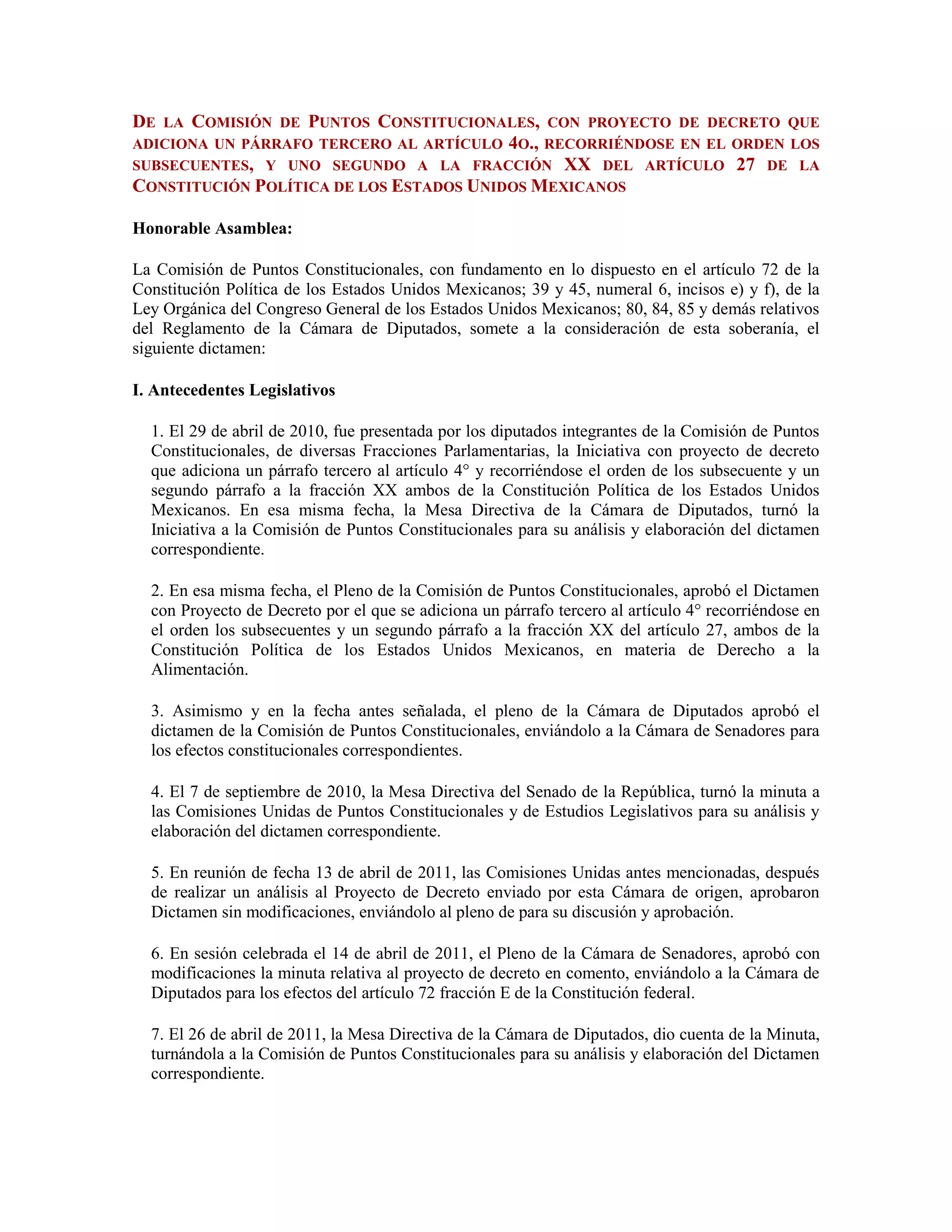 El documento presenta un proyecto de decreto para reformar la Constitución de México y agregar el derecho a la alimentación. Explica los antecedentes legislativos de la propuesta y transcribe el contenido de la minuta aprobada por el Senado, la cual propone incorporar este derecho de forma explícita en la Constitución y establecer la responsabilidad del Estado de garantizar el acceso a alimentos básicos. También argumenta que este derecho ya está implícito y es respaldado por instrumentos internacionales de derechos humanos ratific