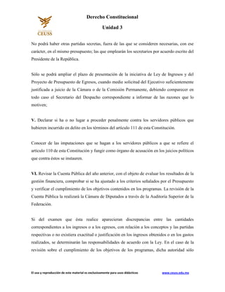 Este documento describe las nueve facultades exclusivas de la Cámara de Diputados de México según el Artículo 74 de la Constitución mexicana. Estas facultades incluyen aprobar anualmente el presupuesto federal, revisar la cuenta pública del año anterior, declarar si se debe proceder penalmente contra servidores públicos, aprobar el Plan Nacional de Desarrollo, y designar a los titulares de los órganos internos de control de organismos autónomos que ejerzan recursos federales.