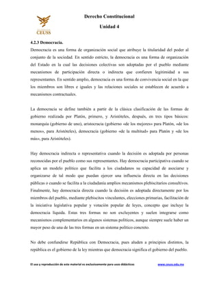 Este documento define y describe la democracia. Explica que la democracia es una forma de gobierno en la que el poder político emana del pueblo, ya sea directamente a través de mecanismos como plebiscitos o indirectamente a través de representantes electos. También distingue entre democracia directa, indirecta y participativa, y señala que estos tipos de democracia a menudo se combinan en los sistemas políticos modernos.