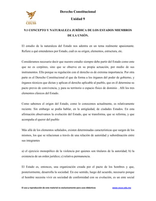 El documento habla sobre el concepto y naturaleza jurídica de los estados miembros de la unión. Explica que el estado es una organización creada por el pacto de los hombres para vivir en sociedad y regularse mediante normas jurídicas. Además, señala que el estado tiene características como el ejercicio monopólico de la violencia y la existencia de un orden jurídico. Por último, menciona que el concepto de estado surgió después de la era medieval y que en Grecia se referían a la ciudad-estado como "