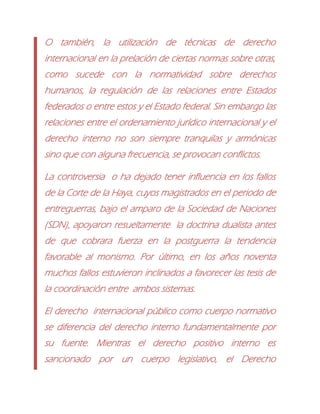 Este documento discute la relación entre el derecho internacional y el derecho interno. Explica que a veces las obligaciones asumidas a niveles internacionales diferentes (universal, regional, subregional) pueden contradecirse, creando conflictos. También describe cómo el derecho internacional ha influido progresivamente en el derecho constitucional interno, por ejemplo en la regulación de los derechos humanos. Sin embargo, las relaciones entre los dos sistemas jurídicos no siempre son armoniosas y a veces provocan controversias. Finalmente, resume las teorías dual