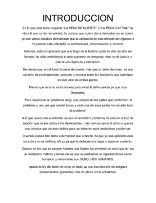 Este documento discute los argumentos a favor y en contra de la pena de muerte como un medio para disminuir la delincuencia. Examina los antecedentes históricos de la pena de muerte y cómo se ha aplicado en diferentes culturas y épocas. También explora las definiciones y objetivos de la pena de muerte, las discusiones sobre su justificación, y las posturas tanto a favor como en contra, incluyendo la posibilidad de error judicial y la irreversibilidad de la pena. Por último, brinda algunos datos sobre cómo se aplica actualmente la