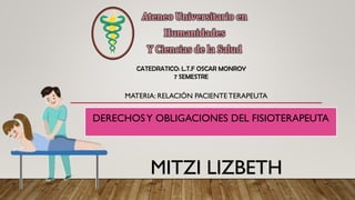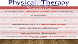El documento describe los derechos y obligaciones de los fisioterapeutas en su relación con los pacientes y otros profesionales. Los fisioterapeutas deben respetar los derechos de los pacientes, cumplir con las leyes y mantener altos estándares éticos. También deben proteger la confidencialidad de los pacientes y responder por sus acciones.