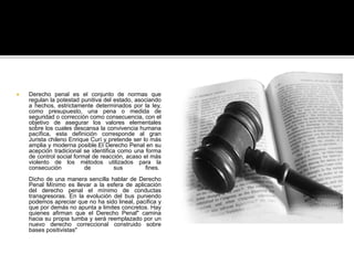 El derecho penal regula las normas que establecen la potestad punitiva del estado para sancionar conductas consideradas delitos. Un delito se define como un acto u omisión prohibido por la ley que atenta contra bienes jurídicos protegidos. El código penal clasifica los delitos y establece diferentes penas y medidas de seguridad aplicables a quienes cometan actos ilícitos.
