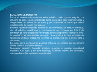 En la antigua Roma, para ser considerado un sujeto de derecho con plena capacidad jurídica, un individuo debía cumplir con tres condiciones: 1) ser libre, es decir no ser esclavo, 2) ser ciudadano romano, y 3) ser sui iuris, o autónomo respecto a cualquier potestad familiar como un padre. Solamente los individuos que cumplían con estas tres condiciones podían poseer y ejercer plenamente derechos y obligaciones legales.