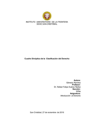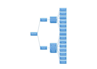El documento presenta un cuadro sinóptico de la clasificación del derecho. Se divide el derecho en público, privado y mixto. El derecho público regula las relaciones del Estado como poder público e incluye el derecho constitucional, administrativo, penal, financiero e internacional público. El derecho privado regula las relaciones entre particulares e incluye el derecho civil, comercial, rural y derecho internacional privado. El derecho mixto incluye el derecho procesal y laboral.