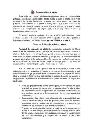 Este documento presenta una discusión sobre diferentes tipos de potestades administrativas, incluyendo la potestad de actuación de oficio, la potestad de autotutela, y la potestad de ejecución. También cubre las responsabilidades de los funcionarios públicos como el deber de fidelidad y los deberes inherentes al cargo. Finalmente, discute los deberes derivados de la organización jerárquica de una oficina administrativa.