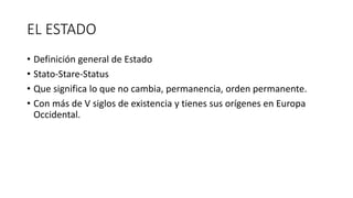 Este documento define el estado y describe su evolución a través de los tiempos. Define el estado como una agrupación humana con territorio, gobierno y orden jurídico que busca el bien común. Explica que el estado ha evolucionado de formas primitivas a través de estados esclavistas, feudales, absolutistas, liberales, intervencionistas, socialistas y fascistas, hasta llegar al estado de bienestar actual. También distingue entre formas de estado unitarias y federales, y entre formas de gobierno como monarquías, repúblicas, dem