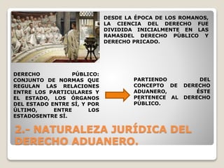 Este documento discute la naturaleza jurídica del derecho aduanero. Explica que el derecho aduanero pertenece al derecho público ya que sus disposiciones son de orden público y no pueden ser modificadas por los particulares. También tiene un elemento internacional debido a la mercancía, personas u origen de los países. El documento analiza los criterios para demostrar la autonomía del derecho aduanero a nivel científico, jurídico, legislativo y docente.