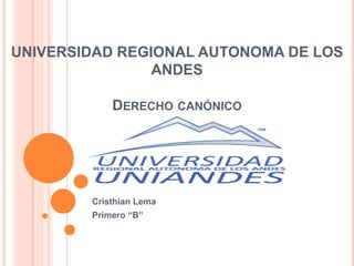 Este documento resume la historia y estructura del Derecho Canónico. Explica que el Derecho Canónico es el sistema jurídico de la Iglesia Católica, el cual ha evolucionado a través de los siglos mediante concilios, decretos papales y codificaciones formales. Actualmente, el Derecho Canónico está codificado en el Código de Derecho Canónico de 1983, el cual consta de siete libros que regulan diferentes aspectos de la Iglesia Católica.